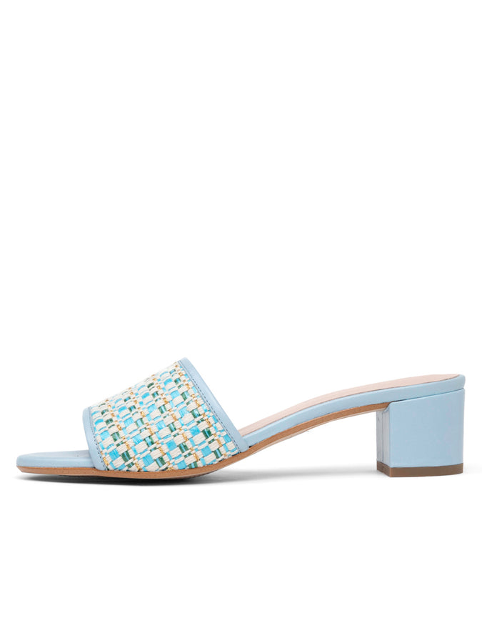 The shoe that made us gasp the first time we saw the samples in Spain! Our coveted block heel design with vibrant patterned raffia and finished with soft leather piping.