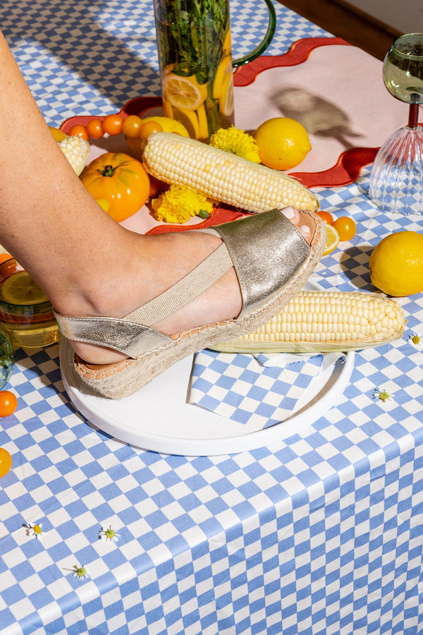 Patricia Green Women’s Gracie Peep Toe Elastic Espadrille in Gold Leather