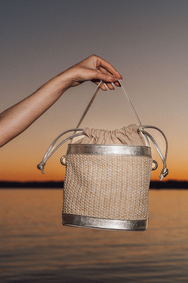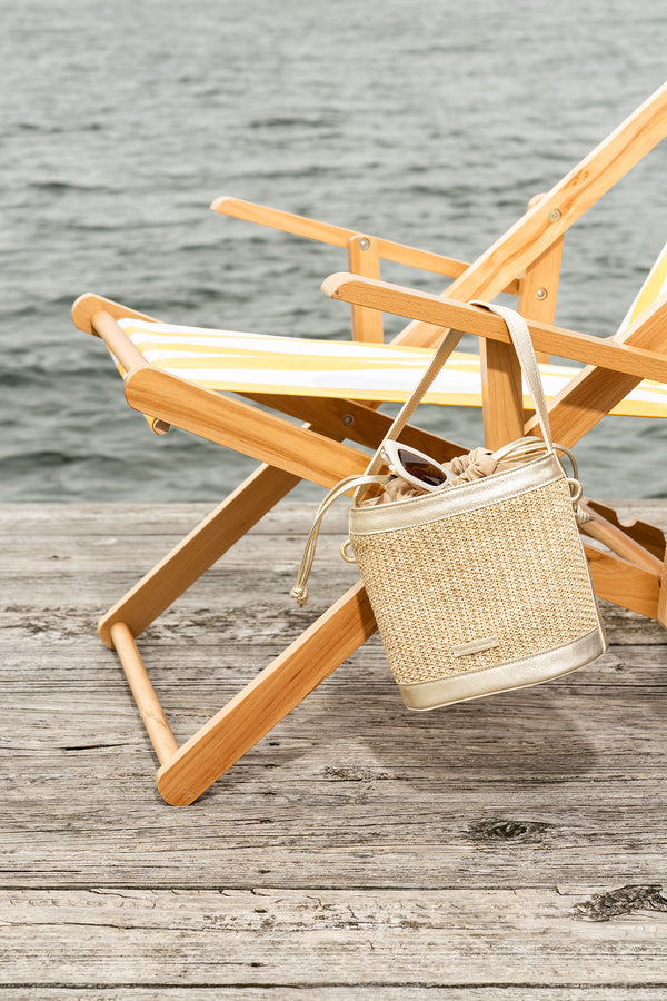 Handmade in Spain in a small, family-owned factory, the Brynn Bucket Bag is a modern classic crafted with the artistry and heritage at the heart of Patricia Green. Woven from natural raffia and finished with shimmering gold leather trim, this elevated carryall blends coastal ease with refined sophistication. The structured bucket silhouette offers effortless versatility, while the soft drawstring closure keeps your essentials secure from beach days to brunch dates. Light, luxurious, and beautifully textured, Brynn is the perfect warm-weather companion—pairing artisanal craftsmanship with everyday elegance. Includes a removable, adjustable strap for versatile wear—carry it by hand, over the shoulder, or as a crossbody.