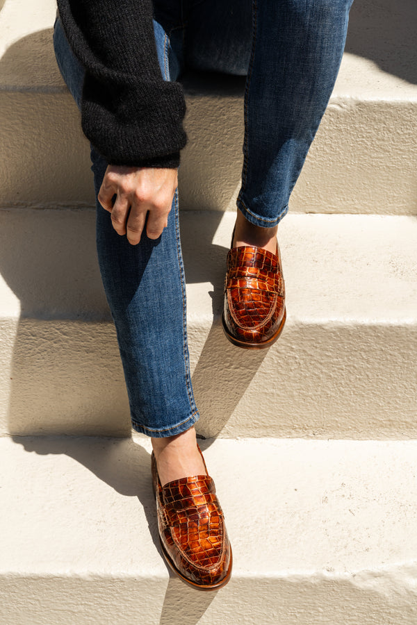 Our most luxurious loafer yet, this loafer is crafted from the highest quality embossed crocodile leather. Buttery soft lining makes these ultra-comfortable and all day walkable.