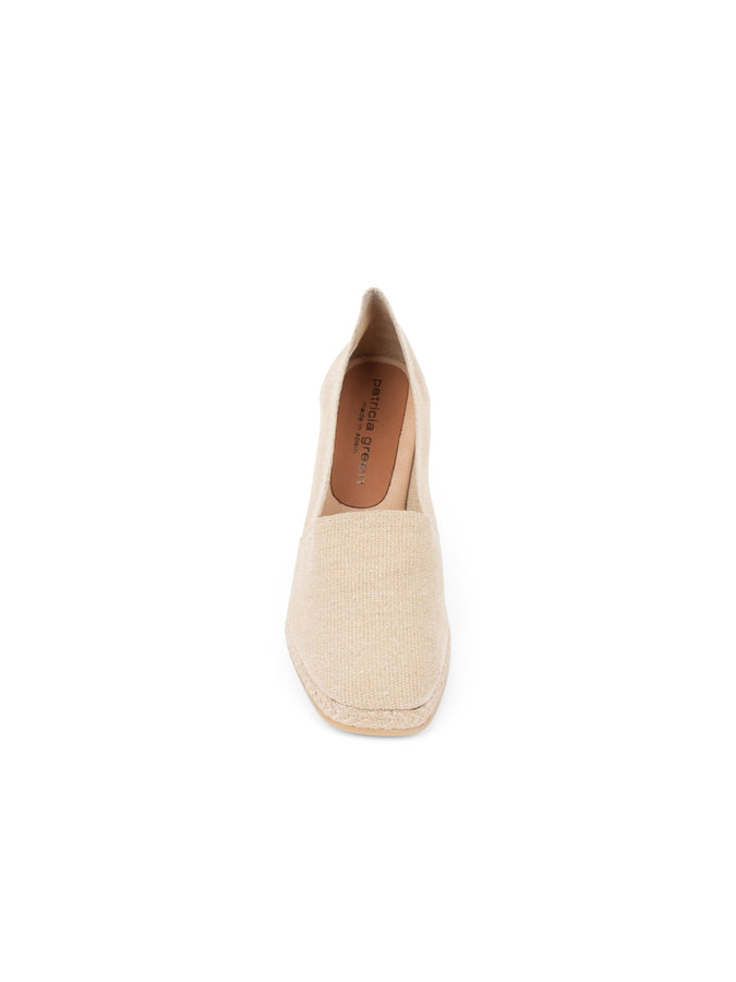 A closed toe stretch linen upper atop a jute wedge espadrille. Handcrafted in Spain by the finest shoemakers. The leathers and materials used to make this shoe are all hand curated by artisans for impeccable fit and quality. Each style is crafted and stitched by hand from a family owned factory. Designed by Patricia Green herself, with a mission to design and develop footwear collections for the contemporary woman. Patricia’s collection embraces refined feminine style, with a touch of whimsy – and are always comfortable to wear!