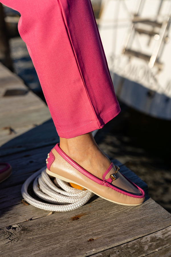 Patricia Green Women’s Finn Driving Moccasin in Tan/Hot Pink Leather