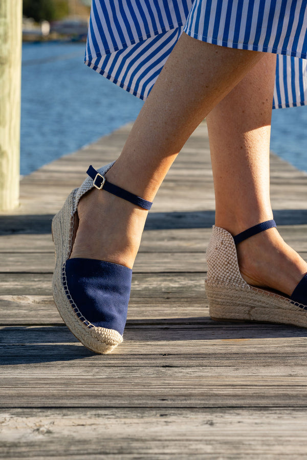 Handcrafted in Spain in small batches, the Sahara Espadrille blends timeless Mediterranean style with modern refinement. The soft suede closed toe offers a clean, elegant look, while the woven heel cup adds texture and artisanal charm. An adjustable ankle strap provides a secure, personalized fit, and the handwoven jute wedge delivers effortless height with all-day comfort. Whether in rich navy or warm tan, the Sahara is a beautifully versatile warm-weather essential—designed with Patricia Green’s signature blend of femininity, craftsmanship, and irresistible ease.