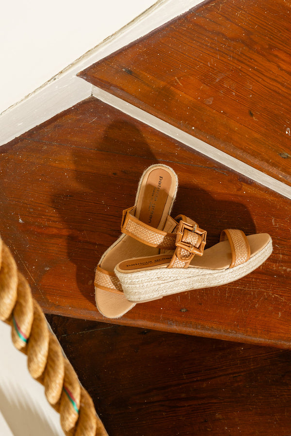 Handcrafted in Spain in small batches, the Soleil Espadrille pairs natural raffia with a striking square bamboo-inspired buckle for an elevated take on warm-weather style. The double-strap design offers a secure, feminine fit, while the handwoven jute wedge provides lightweight lift and all-day comfort. Blending artisanal texture with polished detailing, Soleil embodies Patricia Green’s signature mix of refined simplicity and whimsical charm. A chic, effortless slide that brightens every summer look.