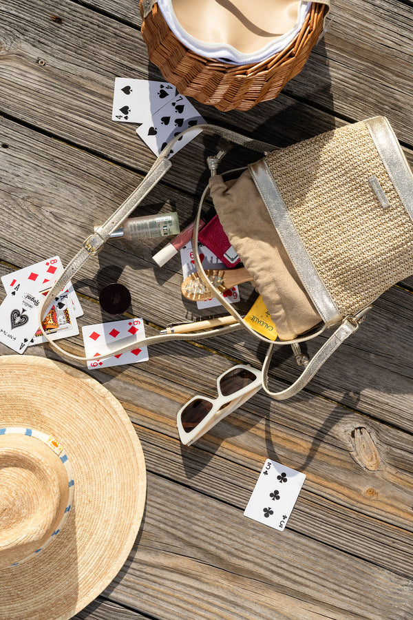 Handmade in Spain in a small, family-owned factory, the Brynn Bucket Bag is a modern classic crafted with the artistry and heritage at the heart of Patricia Green. Woven from natural raffia and finished with shimmering gold leather trim, this elevated carryall blends coastal ease with refined sophistication. The structured bucket silhouette offers effortless versatility, while the soft drawstring closure keeps your essentials secure from beach days to brunch dates. Light, luxurious, and beautifully textured, Brynn is the perfect warm-weather companion—pairing artisanal craftsmanship with everyday elegance. Includes a removable, adjustable strap for versatile wear—carry it by hand, over the shoulder, or as a crossbody.