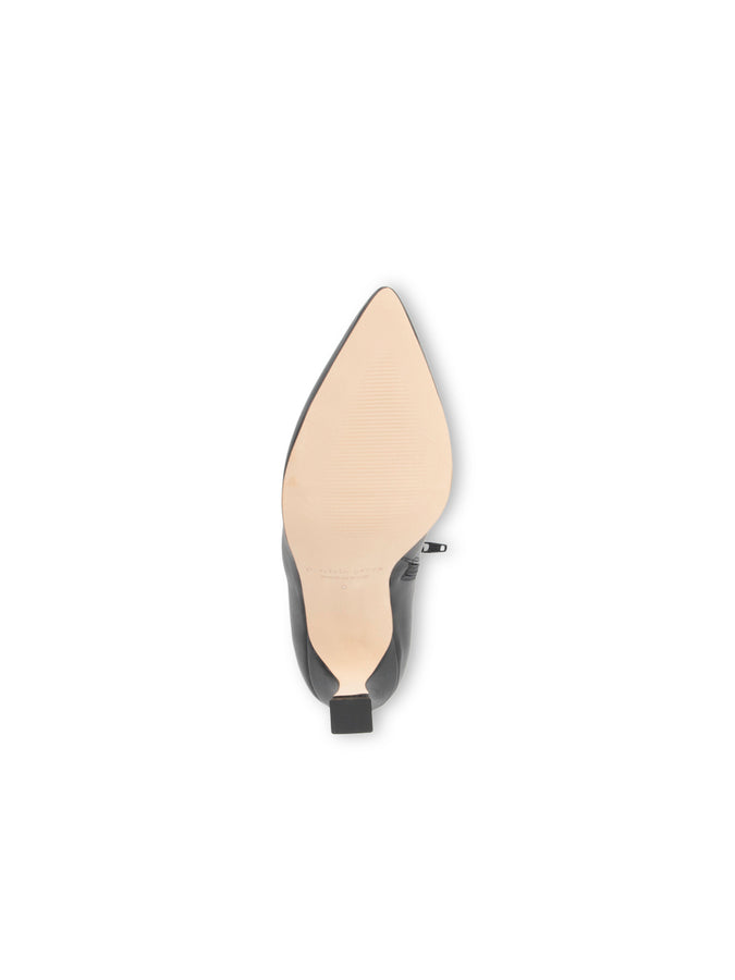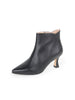 A modern sculpted heel on a timeless pointed toe leather bootie. Supremely comfortable and walkable for all day wear.