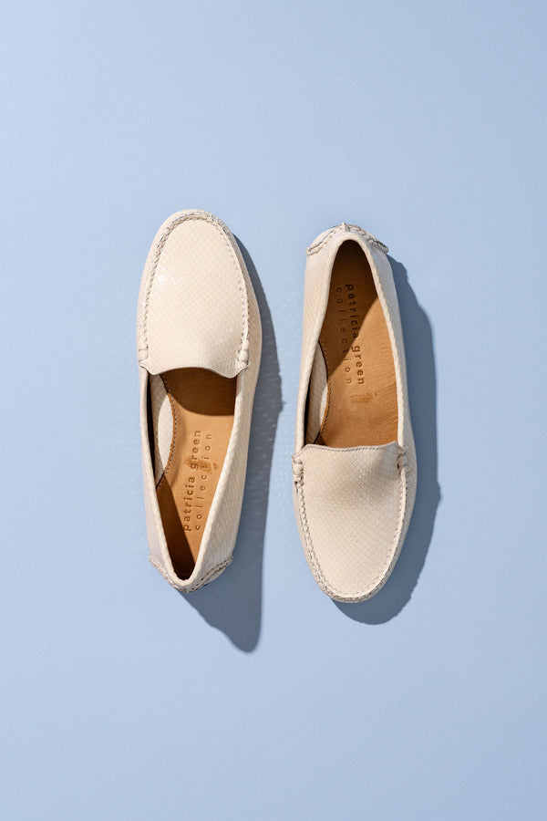 Patricia Green Women’s Jillian Driving Moccasin in Snake in Cream Snake Leather