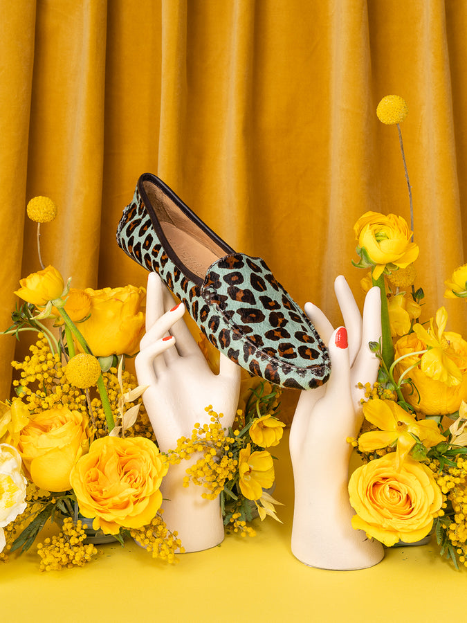 Patricia Green Women’s Jillian Driving Moccasin in Haircalf in Teal Blue Leopard