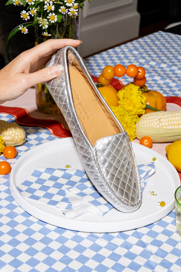 Elevate your style with the Jillian Metallic Quilted Driver, the perfect blend of sparkle, sophistication, and comfort.
