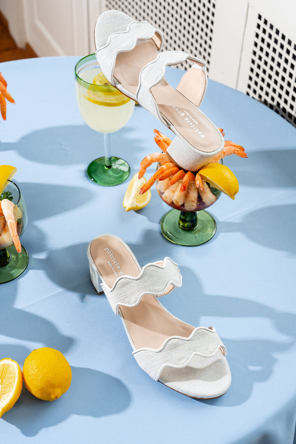 Patricia Green Women’s Palm Beach Block Heel Scalloped Sandal in Light Blue Linen